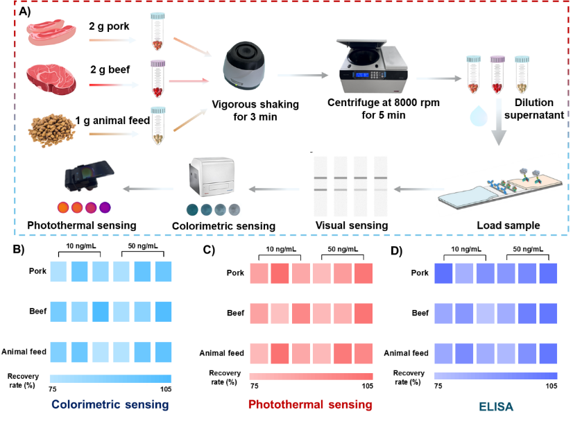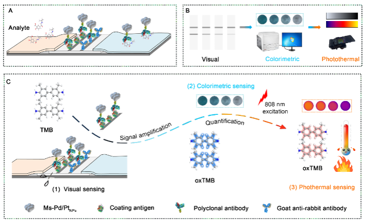 The study integrated Ms-Pd/PtNPs, which possess high catalytic activity, and oxTMB, which exhibits colorimetric and photothermal properties, into an immunochromatographic assay to achieve multimodal visualization, colorimetric, and photothermal sensing for multiple targets. The developed multimodal immunochromatographic method enables the detection of multiple targets in samples of pork, beef, and animal feed. The average recovery rates based on the colorimetric method ranged from 76.0% to 100.8%, while the recovery rates based on the photothermal method ranged from 76.0% to 102.0%. This multimodal immunochromatographic method enhances the flexibility, practicality, and accuracy of analyses, providing a novel approach for instant detection in various application scenarios. The research was supported by projects from the National Key Research and Development Program (2022YFF1101000), the Zhejiang Provincial Natural Science Foundation (LQ23C200006), and the Zhejiang Provincial Key Research and Development Program (2022C02049, 2021C02061).