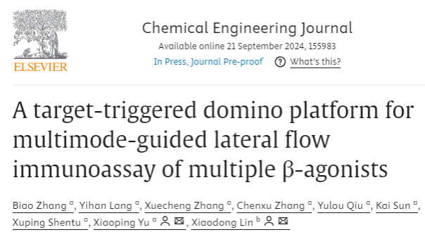 Recently, the team led by Yu Xiaoping at the Institute of Biometry and Inspection Quarantine, College of Life Sciences at China Jiliang University, published a research paper titled "A Target-Triggered Domino Platform for Multimode-Guided Lateral Flow Immunoassay of Multiple β-Agonists" in the prestigious international journal Chemical Engineering Journal. Dr. Zhang Biao from the College of Life Sciences is the first author of the paper, while Researcher Yu Xiaoping and Dr. Lin Xiaodong from the University of California, Riverside, are the co-corresponding authors.
