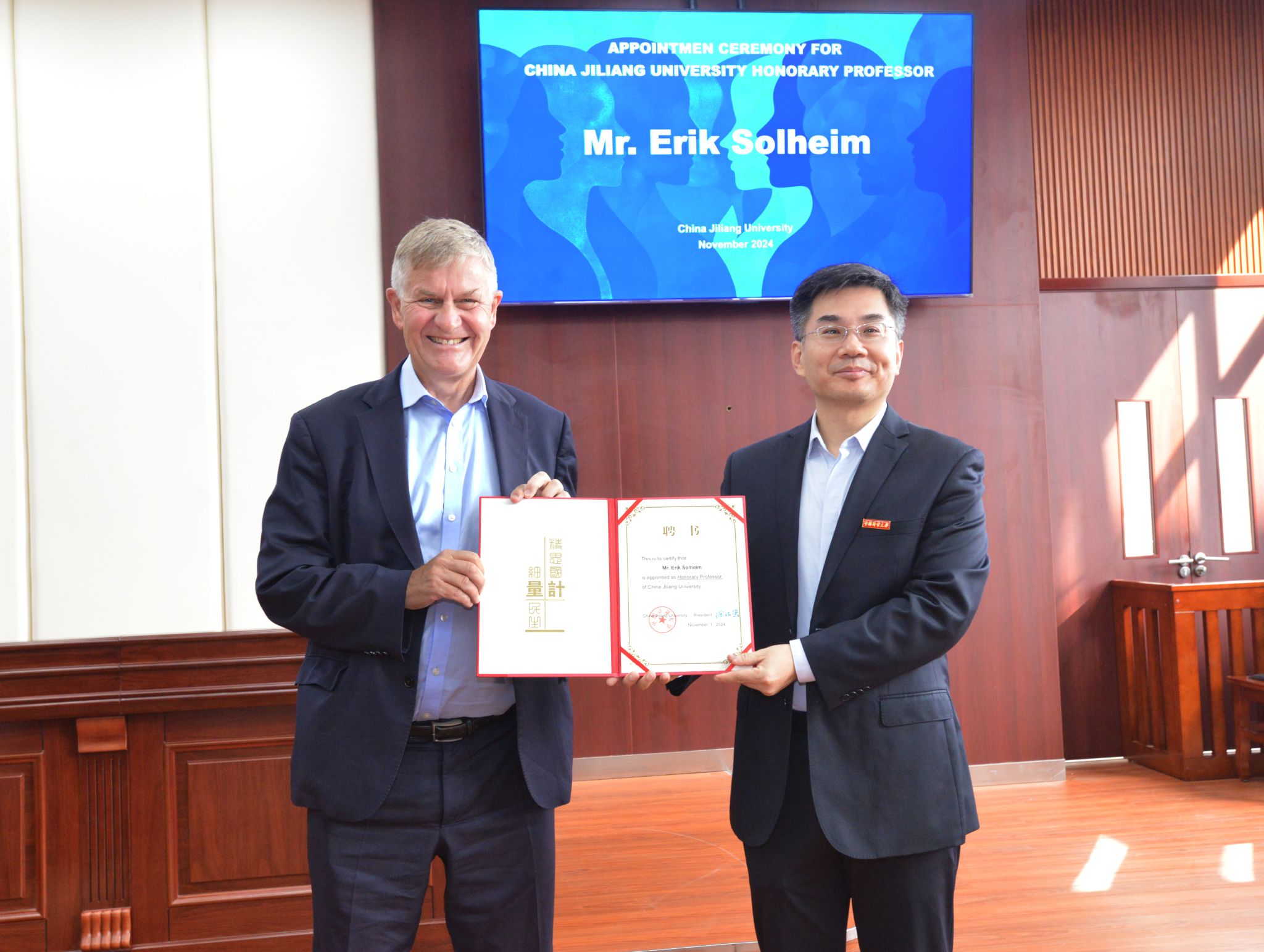 During the conference, Wang Binrui conferred Erik Solheim the certificate of CJLU honorary professorship. Solheim expressed his intention to offer related courses and lectures for the faculty and students, aiming to help connect students with international resources. He also mentioned that Zhejiang's practices in green development could be shared and promoted to youth in more countries through international exchange activities.