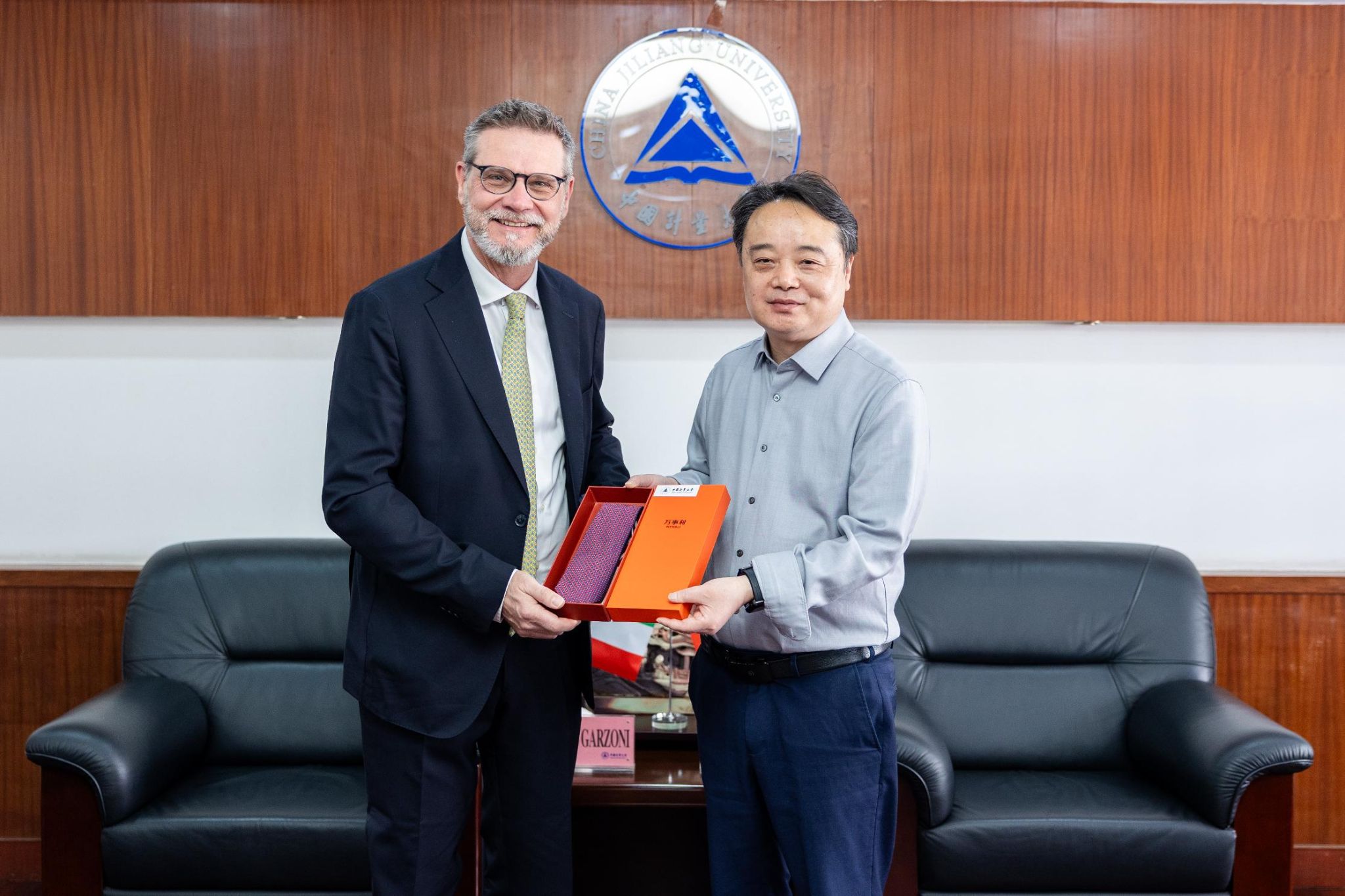 Before the meeting, Xu Jiangrong warmly welcomed the delegation in Meeting Room A209 of the Mingde Building. The two sides engaged in preliminary discussions on talent cultivation and faculty-student exchanges and exchanged commemorative gifts. Xu noted that LUM serves as a benchmark institution in southern Italy for integrated research in economics, management, and law, boasting outstanding achievements in these fields. Given its strong alignment with the disciplines of the College of Economics and Management and the School of Law & School of Intellectual Property in CJLU, there is great potential for collaboration. He expressed his hope that this visit would serve as a catalyst for deepening mutual understanding, establishing a high-level academic exchange platform, promoting the sharing of educational resources, and advancing substantial and meaningful cooperation.