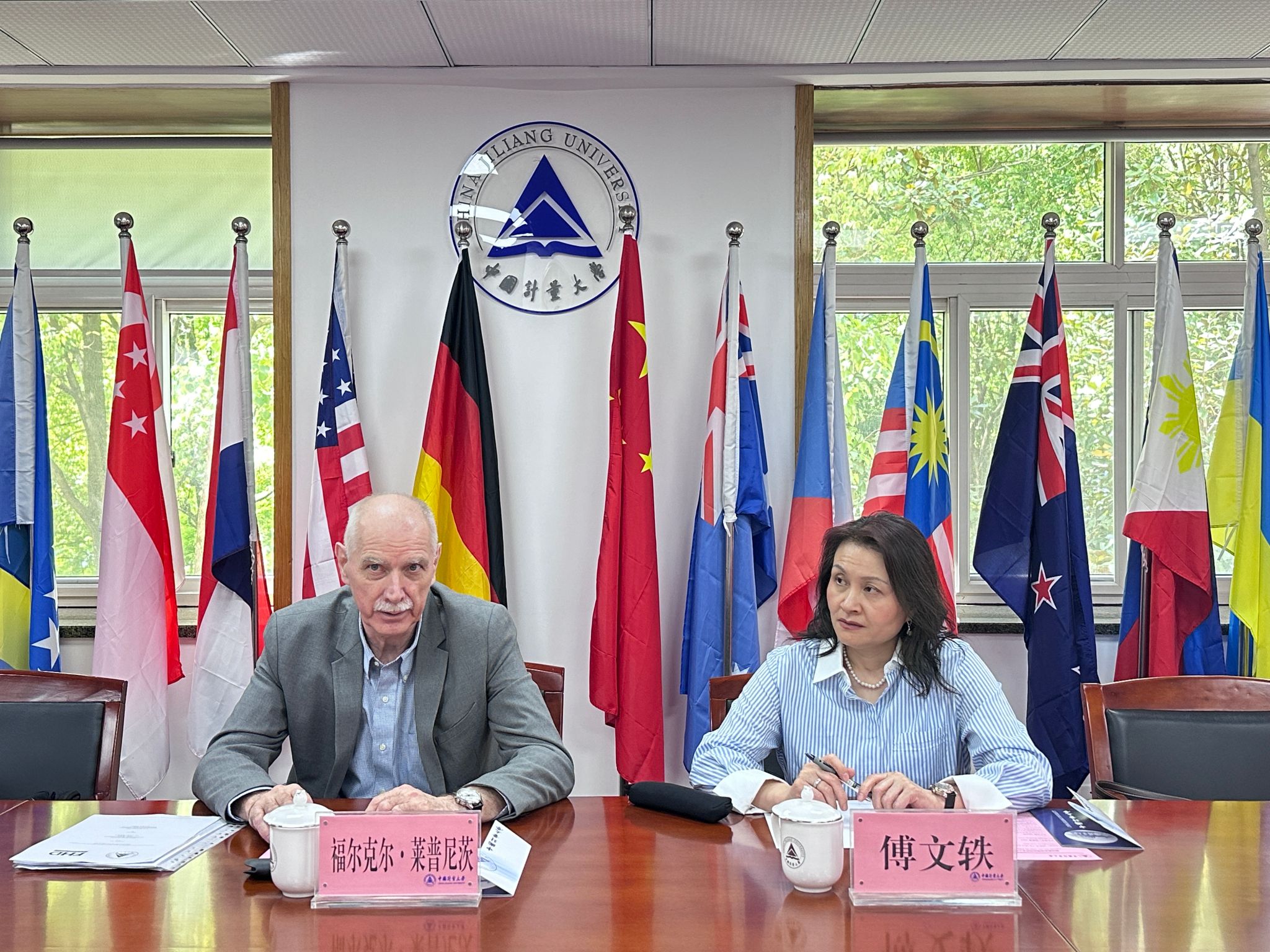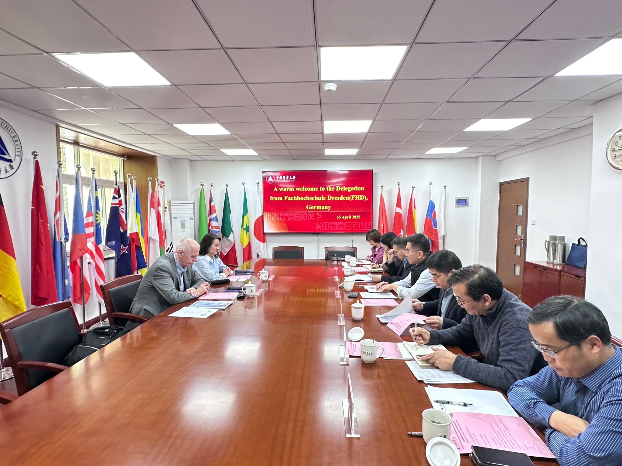 On the morning of April 15, a delegation from Dresden University of Applied Sciences (FHD), Germany, visited China Jiliang University (CJLU) to discuss plans for establishing a German Language Teaching Center at CJLU, among other areas of cooperation. The delegation was led by Mr. Volker Leipnitz, Member of the Board at FHD, and Ms. Weny Fu, Director of the International Office. Vice President Wang Binrui attended the reception. Representatives from the International Office, School of International Education, College of Information Engineering, College of Economics and Management, College of Foreign Languages and Cultures, and College of Art and Communication also joined the meeting.