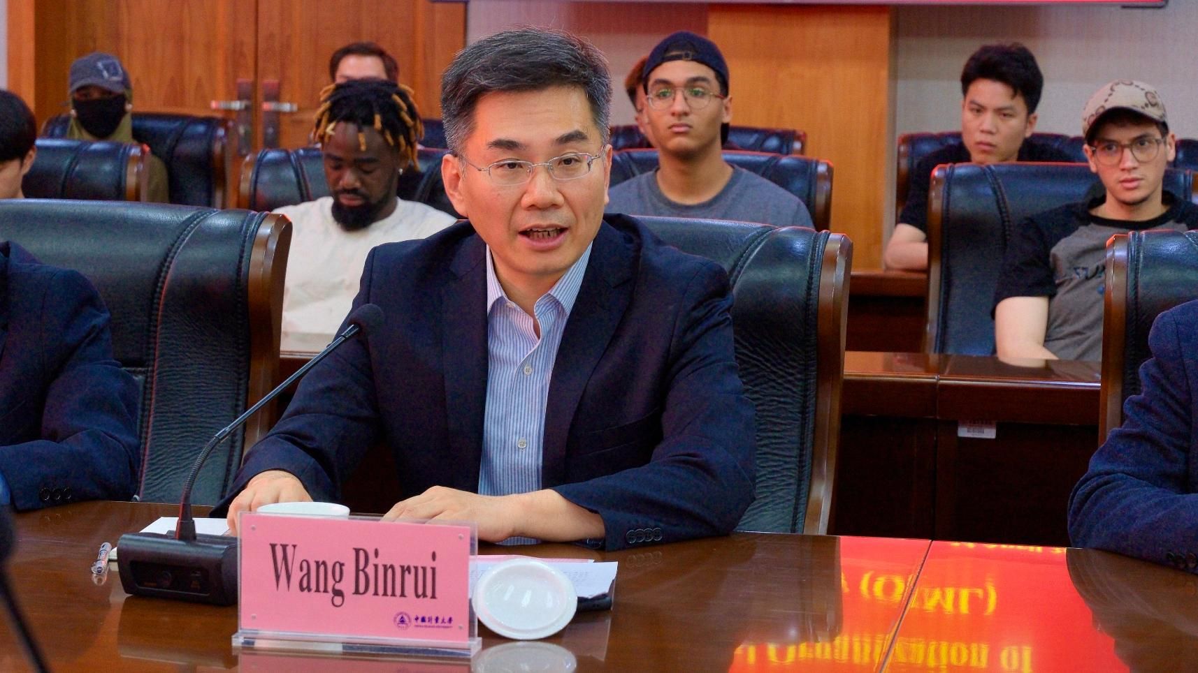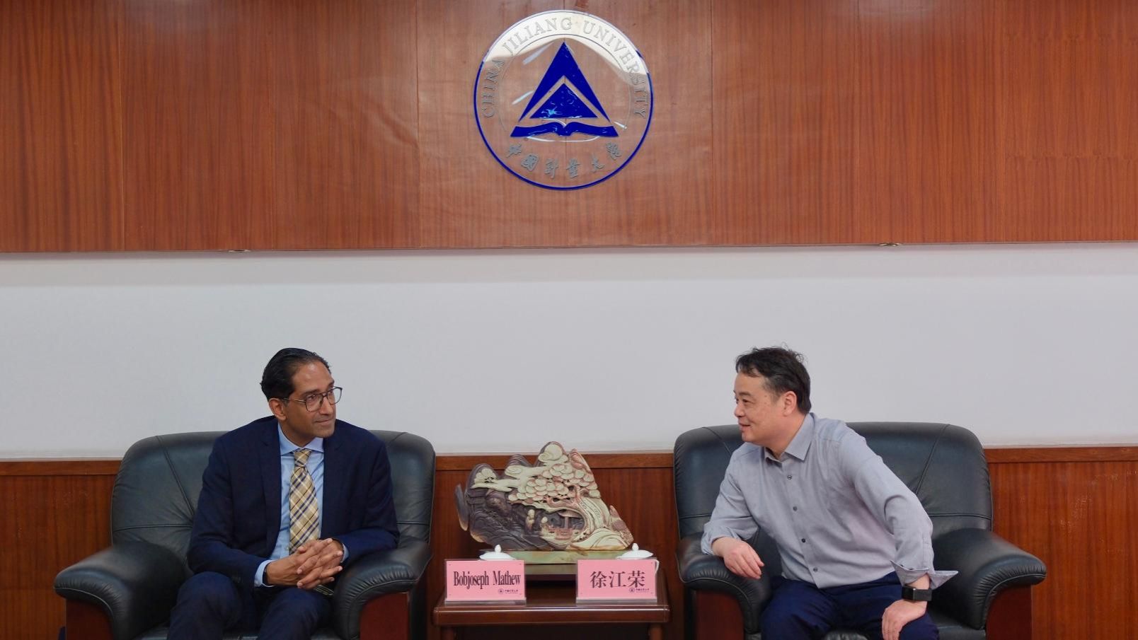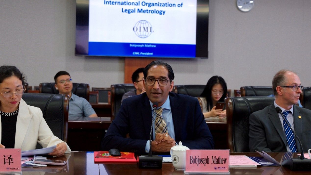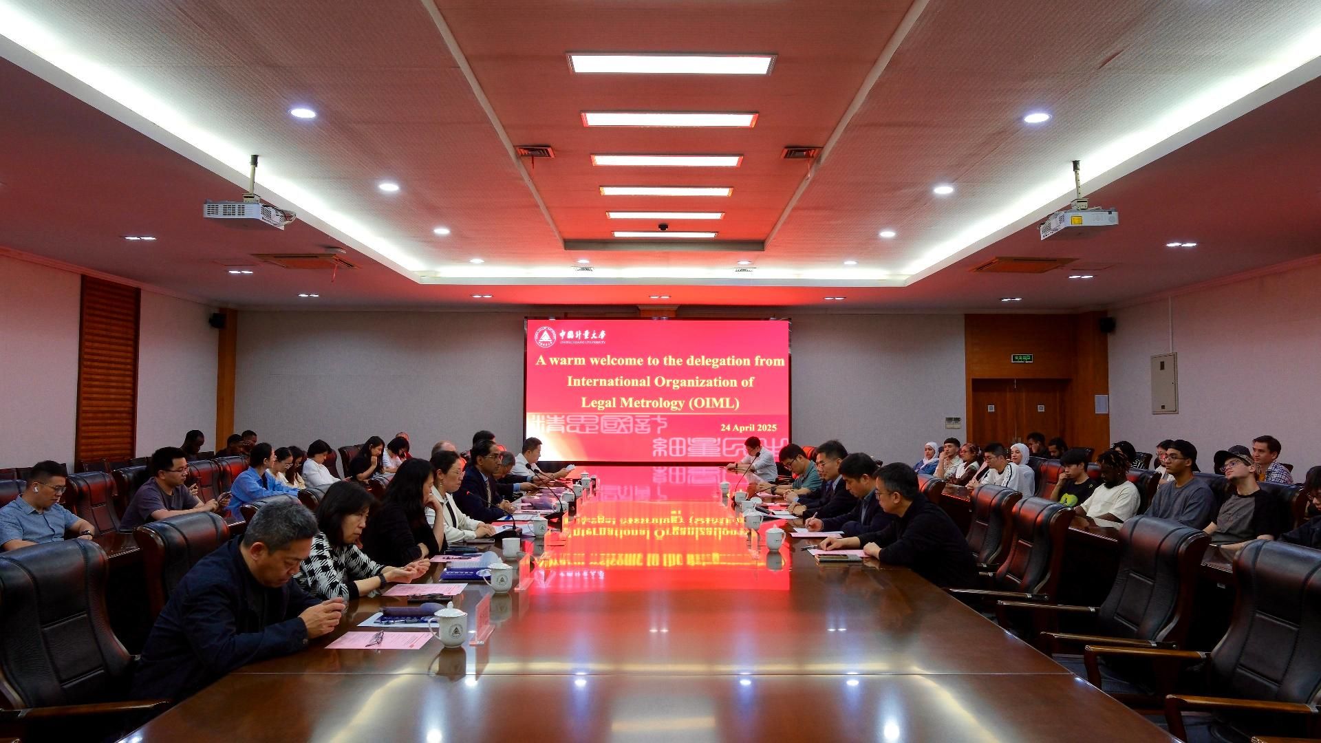 On the afternoon of April 24, Bobjoseph Mathew, President of the International Committee of Legal Metrology (CIML) of the International Organization of Legal Metrology (OIML), and Paul Dixon, Deputy Director of the International Bureau of Legal Metrology (BIML), led a delegation to visit China Jiliang University (CJLU). Liu Xinmin, former Deputy Director-General of the State Administration for Market Regulation (SAMR), as well as heads of relevant divisions of SAMR and representatives from the National Institute of Metrology (NIM) and the Shanghai Institute of Measurement and Testing Technology (SIMT), also attended the exchange activities. Xu Jiangrong, Secretary of the Party Committee of CJLU, and Vice President Wang Binrui received the guests. Heads from the International office, the School of International Education, and the College of Metrology Measurement and Instrument participated in the discussions.