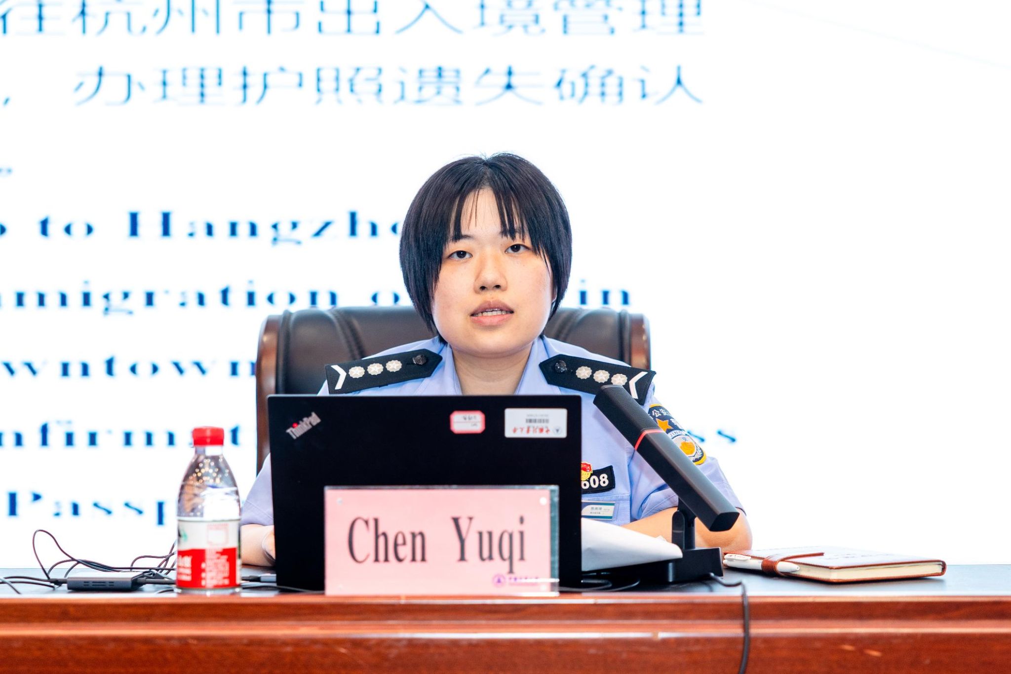 Following the ceremony, Officer Chen Yuqi from the Qiantang District Exit-Entry Administration Division gave a briefing on key laws and regulations concerning residence, visa policies, and public services for foreigners in Hangzhou, helping students better adapt to life in China.