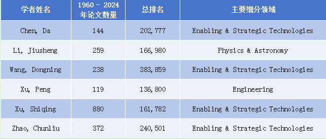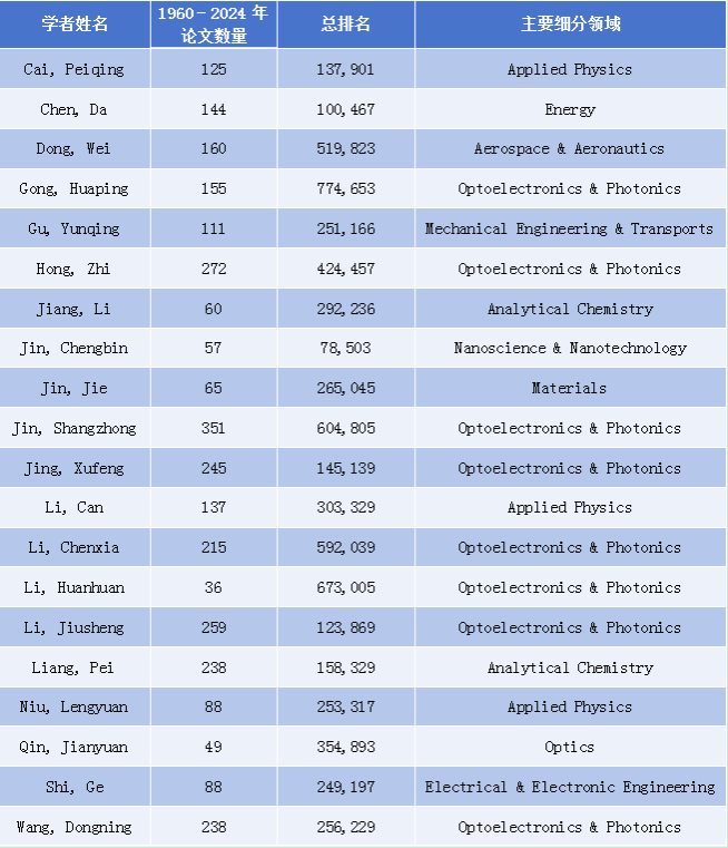 Among them, six scholars, including Professor Xu Peng, were also listed in the Career-Long Scientific Impact Ranking, with concentrations mainly in Optical Engineering and Materials Science and Engineering.