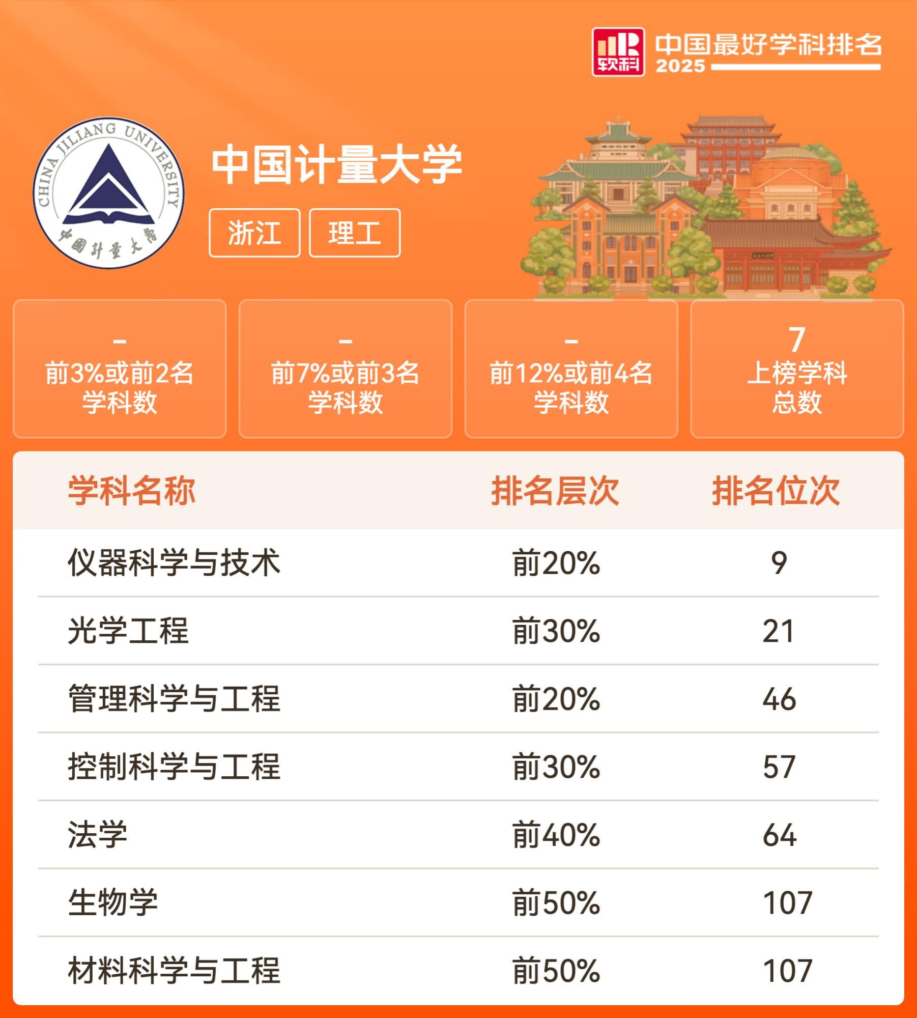 On October 15, ShanghaiRanking, a professional higher education evaluation institution, released the 2025 ShanghaiRanking’s Best Chinese Subjects, in which a total of seven disciplines from China Jiliang University were listed. Compared with the 2024 rankings, Instrument Science and Technology rose from 14th to 9th, and Management Science and Engineering advanced from 71st to 46th, both ranking within the top 20%. Optical Engineering improved from 37th to 21st, and Control Science and Engineering moved up from 81st to 57th, both entering the top 30%. Law ranked among the national top 40, while Biology and Materials Science and Engineering were both listed within the national top 50. This indicates that the University has initially established a distinctive and high-performing disciplinary ecosystem marked by prominent strengths and overall enhancement.